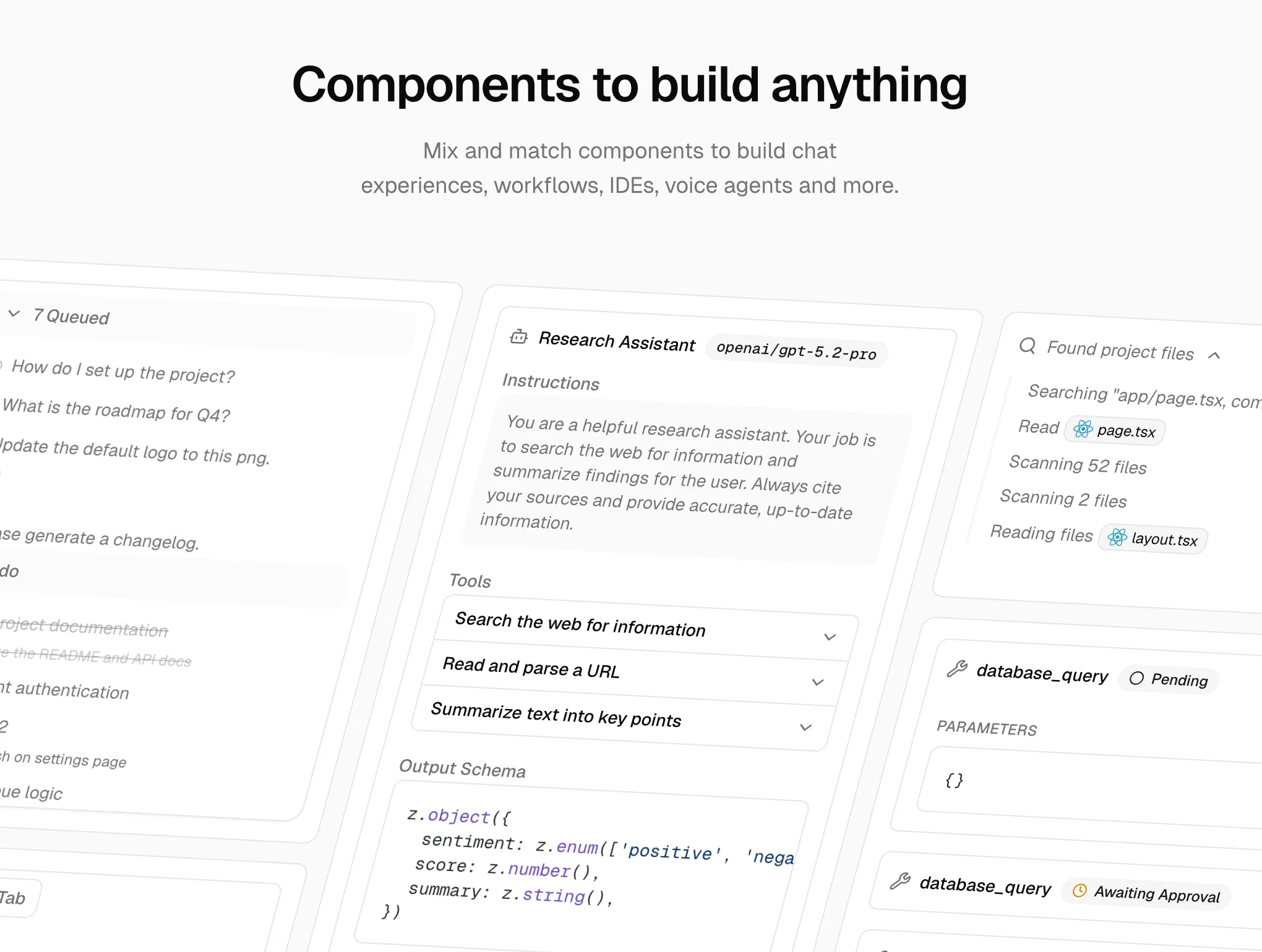 Vercel AI SDK has built-in support for this pattern through the useChat hook with tool invocations. AI SDK Elements extends this with 29+ pre-built, shadcn/ui-based components for chat experiences, workflows, IDEs, and voice agents. If you're already building on Next.js, this is the lowest-friction path to rendering components in response to tool calls.