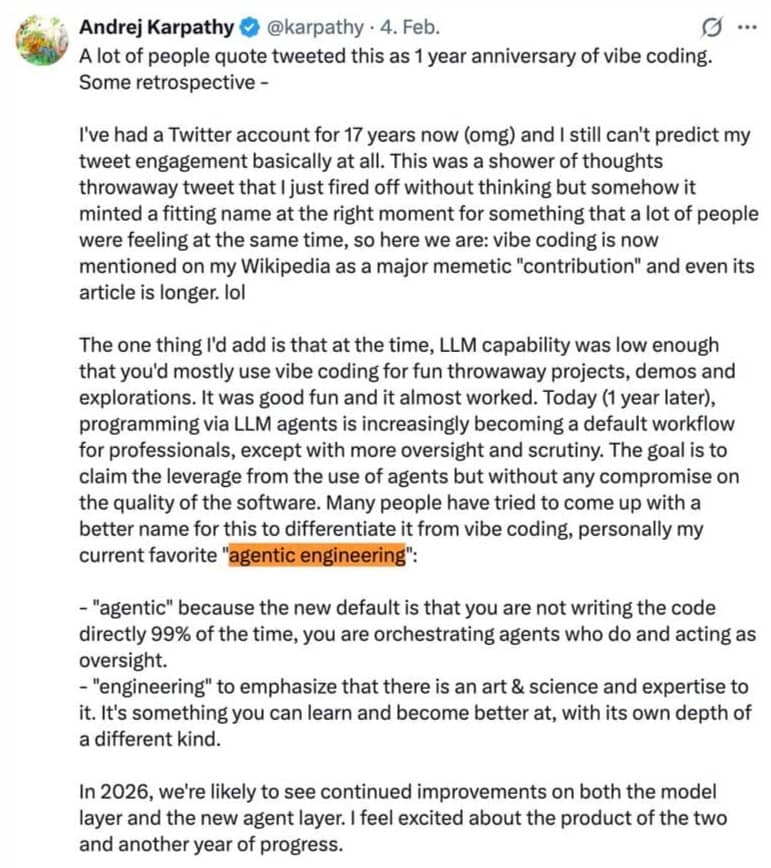 โ From Vibe Coding to Agentic EngineeringA year and a half ago, I sat in front of Lovable, typed what I wanted, and watched an app appear. It felt like magic. I described a feature. It built it. I described another one. It built that too. Within a weekend, I had something that looked like a real product. And honestly? For what I needed at that stage (validating an idea, seeing if something could work) it was exactly right. Vibe coding got me to my first product and I'm very grateful for that. But then things got real. I wanted to add sharing functionality. I needed proper error handling. Security wasn't optional anymore. I had users signing up, and suddenly "describe and pray" wasn't a strategy, it was a liability. I'd fix one thing and break two others. I couldn't debug what I didn't understand. And the further I went, the more I realized: the tool wasn't the problem. My approach was. And markdowns alone don't help. I was still vibing when I needed to be engineering. The shiftThe transition didn't happen overnight. It was messy. I moved to Claude Code and spent weeks figuring out what worked and what didn't. I dumped everything into a single CLAUDE.md file and wondered why it ignored half of it. Slowly, I started building structure around the chaos: Rules for path-based guardrails, so security standards loaded automatically when I touched sensitive files, not because I remembered to mention them. Skills for repeatable workflows, so I wasn't re-explaining the same design patterns every session. Hooks for quality checks, automated gates that caught issues before they shipped. Subagents for autonomous tasks, letting agents handle scoped work independently while I focused on architecture. MCPs for external tool access, connecting agents to the services they actually needed. It took months of trial and error. But at some point, I realized I wasn't just using AI to write code anymore. I was orchestrating agents. Defining standards. Reviewing output. Making architectural decisions. I'd gone from creative director to technical lead without fully noticing the shift. This isn't just meA week ago, Andrej Karpathy (the person who coined "vibe coding" a year ago) posted this on X (link): Read that again. The person who started the vibe coding movement is now saying: the next evolution is agentic engineering. "Agentic" because you're not writing the code; you're orchestrating agents who do. "Engineering" because there's a real art and science to doing it well. It's a skill you develop. It has depth. This isn't about vibe coding being bad. It's about recognizing that what got you started isn't always what gets you to the finish line. Where are you in this?If you're still in the vibe coding phase (exploring ideas, testing concepts, building your first prototype) stay there. That's exactly where you should be. Lovable, v0, Bolt: they're brilliant for that. But if you've been noticing the cracks like builds that break in ways you can't trace, features you can't maintain, security you're crossing your fingers on ๐ that's the signal. It doesn't mean you need to become a traditional developer. It means you need more structure around how you work with AI. More intention. More engineering. The good news: you don't have to figure it out from scratch. I already made the mistakes. Go deeperIf you're ready to make that shift, I wrote a comprehensive guide on how to set up Claude Code's customization layers (rules, skills, subagents, MCPs) so your agents actually listen and your builds are reliable from the start. ๐ Claude Code Customization Guideโ (Apologies for missing the link last time!) It's the article I wish I'd had 12 months ago. Oh, and you might have noticed this newsletter quietly changed its name from Vibe Coding Solopreneurs to Agentic Solopreneurs. Now you know why. โ P.S.: Reply to this email if you're somewhere in this journey. I'd love to hear where you are and where you're trying to get to. |